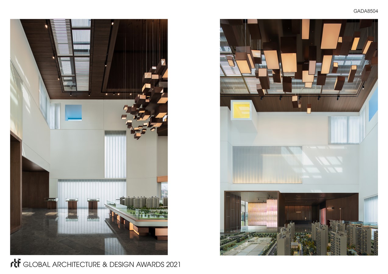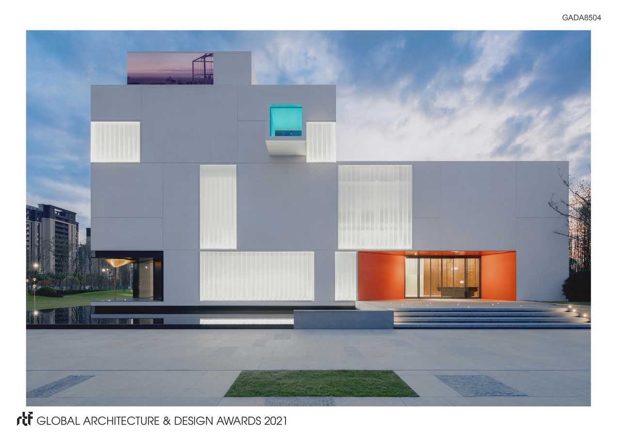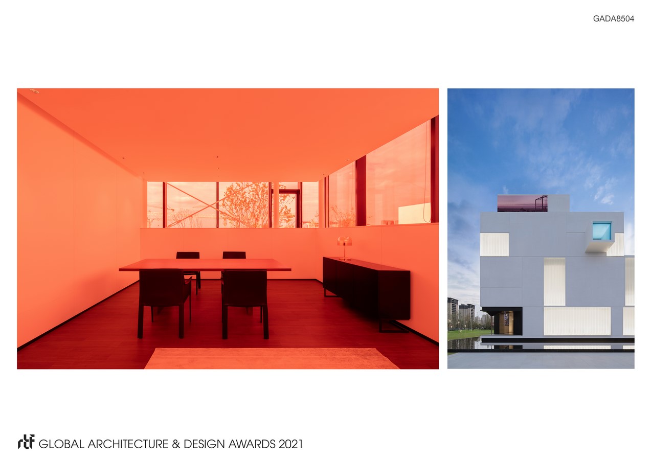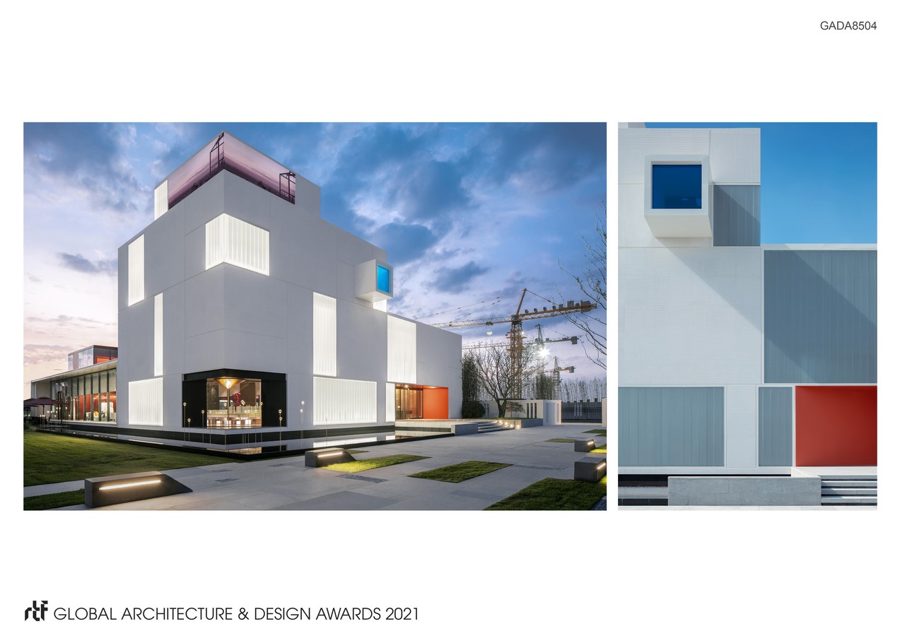 This building is a “box area” with “boxes” inside,which arranges the basic functions to satisfy the needs of negotiation, exhibition and work., meanwhile, reserve empty space appropriately. By control the height and colors of boxes to create the forge the diversity and tension of the space. The design of high ceiling above the exhibition area is extension of the function and the symbol of spirit. It is the core sprit of this building. To chamfer a bottom of the box to correspond with the crossroad, which express the modesty and self-discipline of the building. The entrance is embedded in the building with the material and color variations, not eye-catching but distinct.