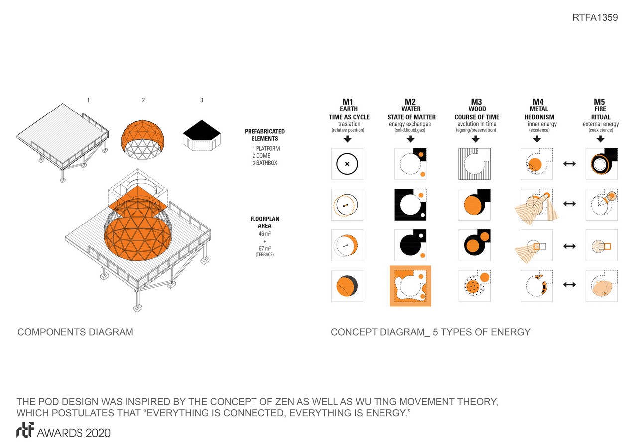 The pod design was inspired by the concept of Zen as well as the Wu Ting movement theory, which postulates that “everything is connected, everything is energy.” The 5 movements (or type of energies) are each connected to an element; the translation to the earth, the exchange of energy to the water, the evolution of time to the wood, the inner energy to the metal, and finally the external energy to fire.