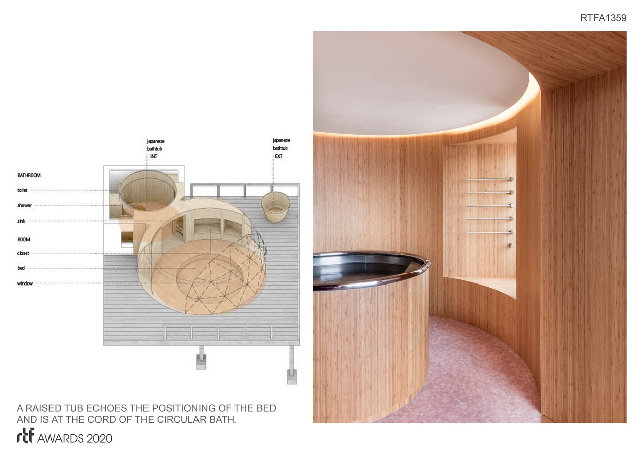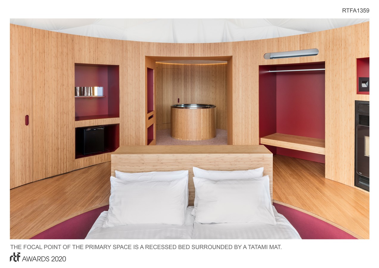The wooden walls are curved to define these spaces and finished with precise details. The focal point of the primary space is a recessed bed surrounded by a tatami mat and a raised tub echoes this positioning at the core of the circular path. Human ritual lies at the heart of Pod construction, and in the midst of breathtaking mountain views, it has become a transformative experience.