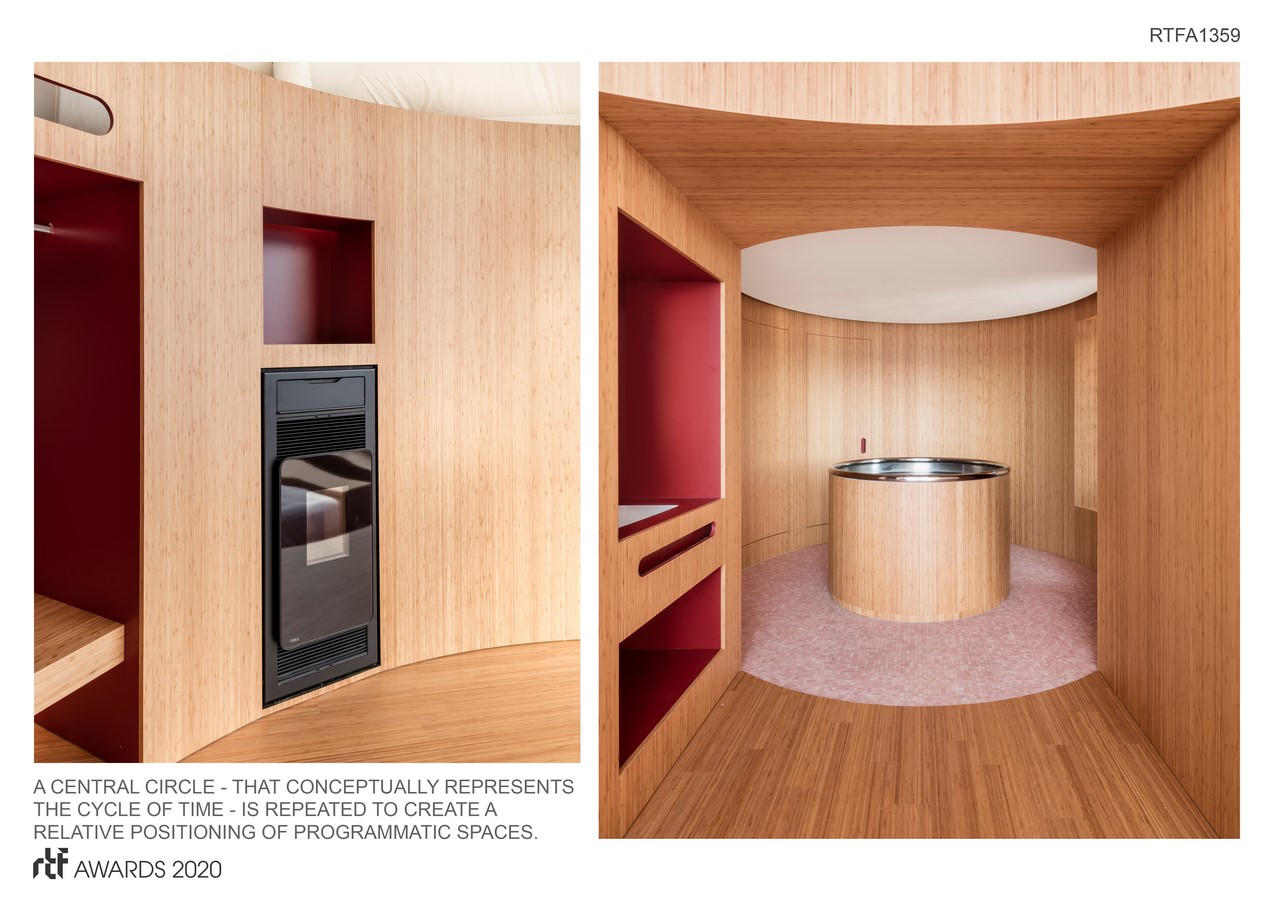 The interconnectivity and the notion of the ritual of the five natural elements inform both the Pods’ exterior and interior.  A central circle – that conceptually represents the cycle of time – is shifted and duplicated to create a relative positioning of programmatic spaces.