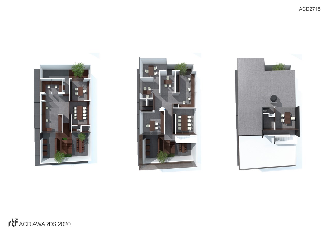 The architectural program includes on the ground floor a common reception, lounge area, kitchenette, offices, assistant area, management, boardroom and reading area. On the first level there is a meeting room, private and common offices. And a second level with a private area and site. All levels have archive spaces, printing area, toilets and septic for cleaning.