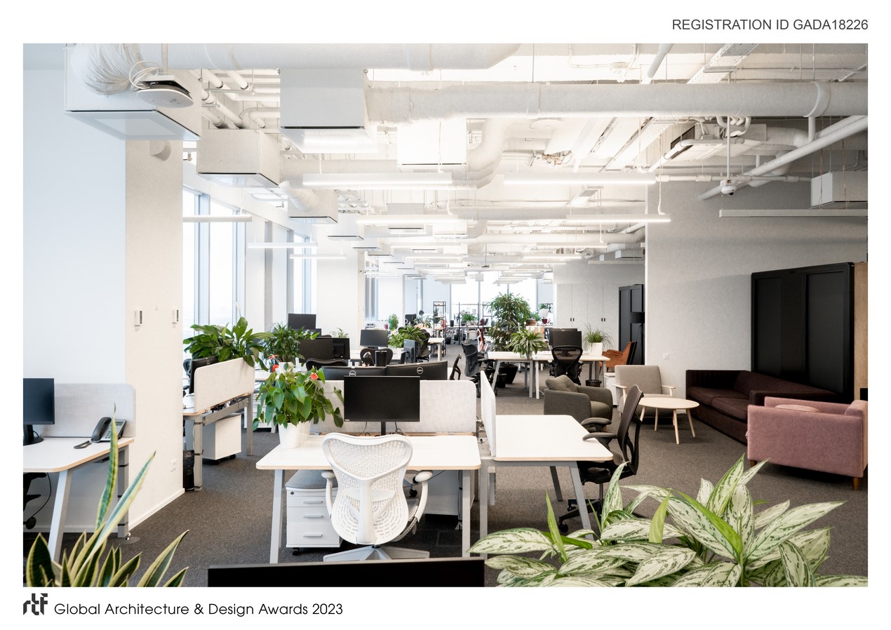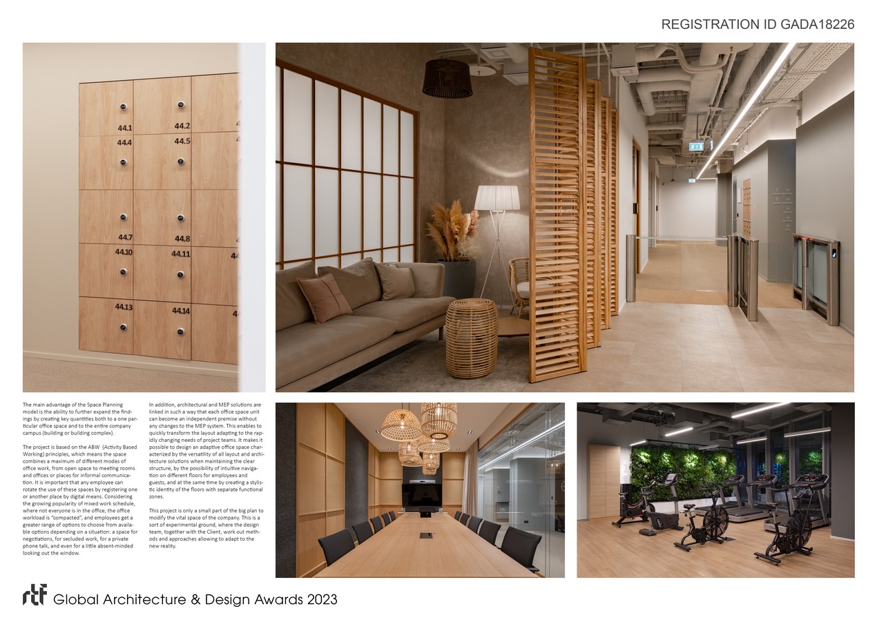 In addition, architectural and MEP solutions are linked in such a way that each office space unit can become an independent premise without any changes to the MEP system. This enables to quickly transform the layout adapting to the rapidly changing needs of project teams. It makes it possible to design an adaptive office space characterized by the versatility of all layout and architecture solutions when maintaining the clear structure, by the possibility of intuitive navigation on different floors for employees and guests, and at the same time by creating a stylistic identity of the floors with separate functional zones.