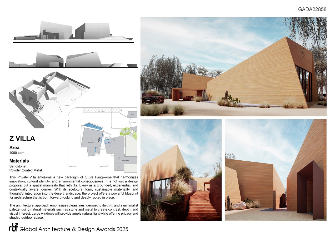 Z Villa is a contemporary residence that reinterprets cultural tradition through a lens of refined minimalism and sculptural clarity. Situated in a desert landscape, the architecture balances solidity and openness, offering spaces that support reflection, social connection, and immersive living. The design is rooted in material authenticity and spatial sequencing, forming a layered experience that moves from intimacy to grandeur.