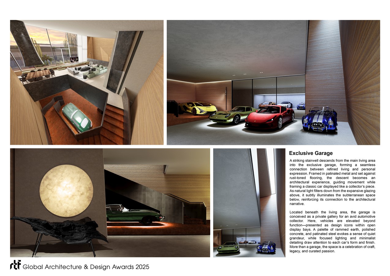From this main space, a staircase wrapped in patinated metal leads downward to a subterranean garage designed as a private gallery. Created for an avid car collector, the garage uses a restrained palette of rammed earth texture, polished concrete, and brushed steel to elevate each vehicle into a display object. Focused lighting and natural daylight from above create a museum-like atmosphere that remains visually connected to the villa above.