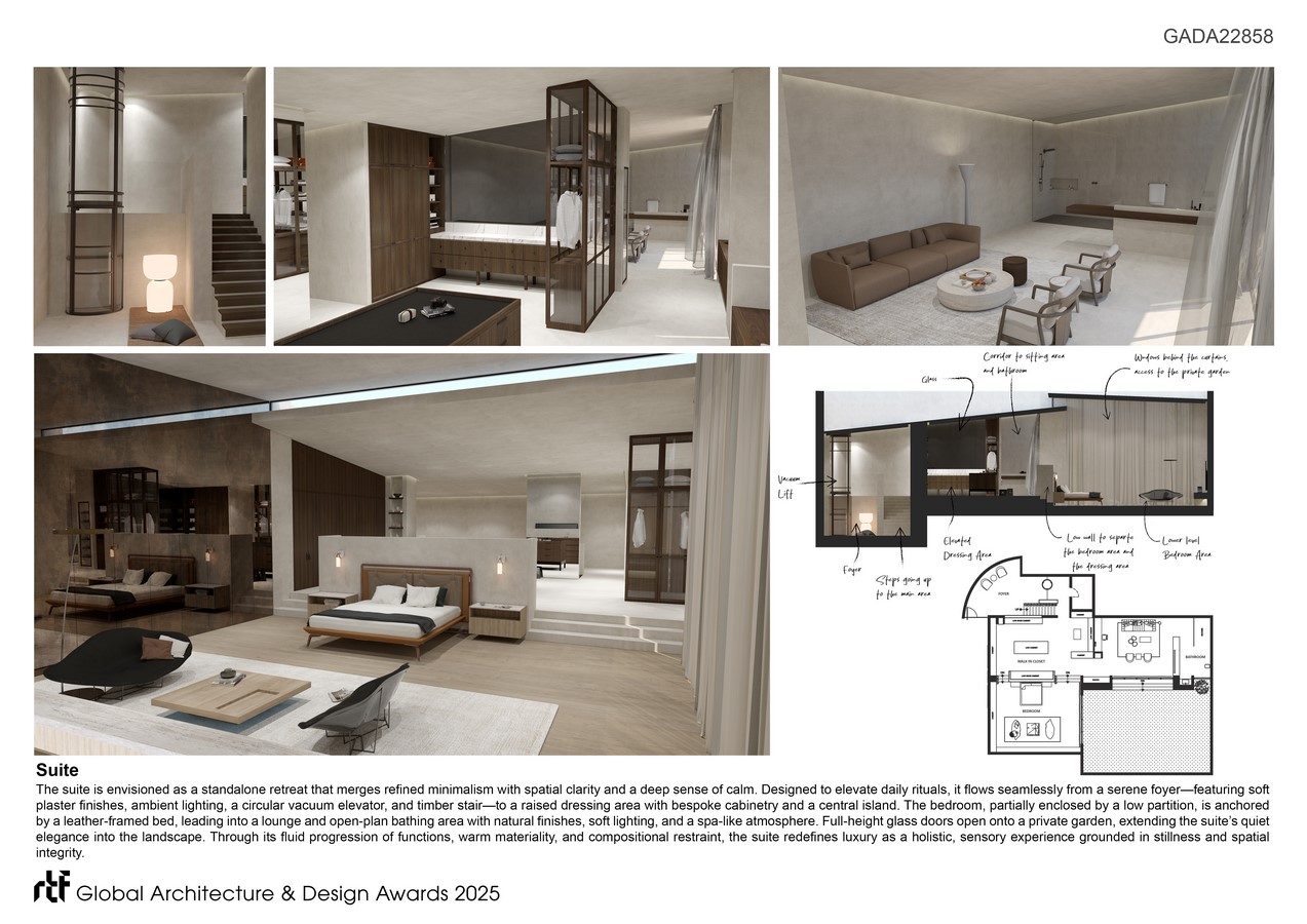Integrated within the residence is a private suite, conceived as a calm, flowing retreat. The entry begins with a soft-toned foyer and a sculptural stair beside a glass elevator, forming a vertical core. The layout ascends to an elevated dressing area with bespoke cabinetry and mirrors, then steps down into a sleeping zone defined by a leather-framed bed and tactile finishes. Beyond lies a lounge and open-plan bathing area with natural stone, a walk-in shower, and ambient lighting. Full-height glazing opens to a private garden with shaded seating, extending the suite’s meditative quality into nature.