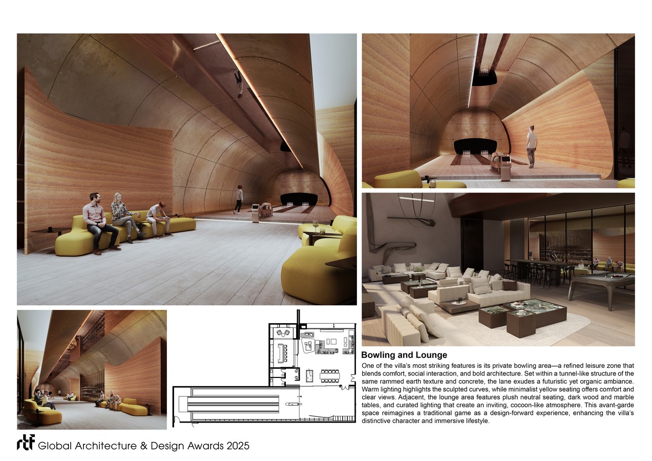 One of Z Villa’s most distinctive features is the private bowling area—a dramatic, tunnel-like structure finished in rammed earth texture and smooth concrete. Warm indirect lighting highlights its curvature, while minimalist yellow seating offers comfort for observers. The space reframes a traditional game in a contemporary, avant-garde setting.
