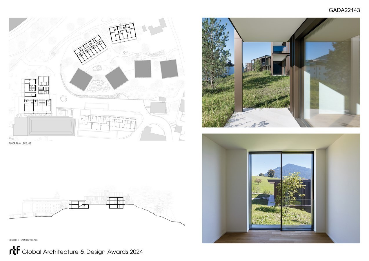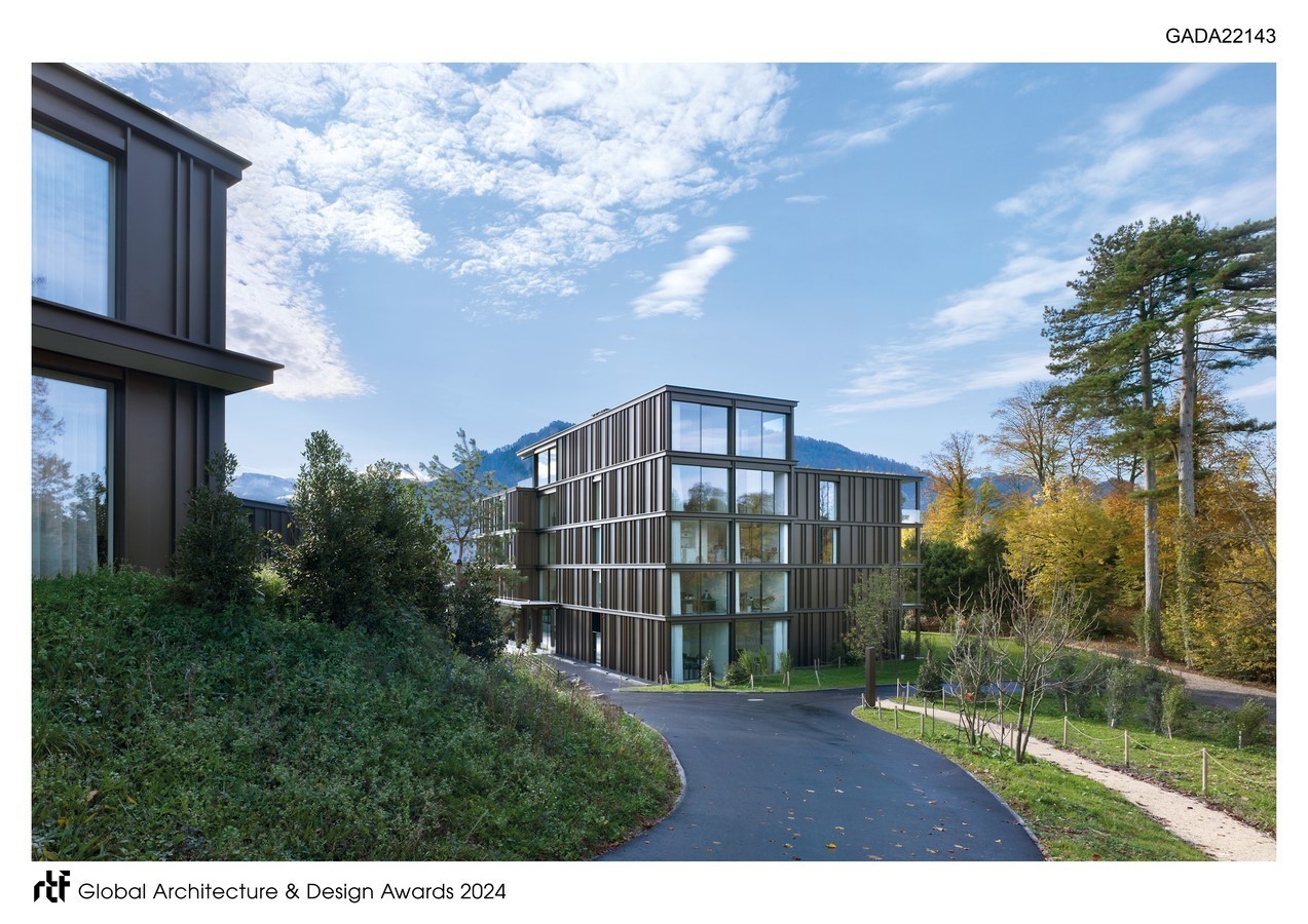 The proposed project develops a holistic, park-like facility with large open spaces, forest and lakeside zones, footpaths and promenades, as well as lush vegetation, modestly integrated into the landscape. While the Cereneo Centre is attached to the Campus Hotel and integrated with the surrounding area and the local environment, the Campus Village is designed in a fine-grained settlement structure along the ledge of a hill and follows the line of the natural topography and its scale, while also being orientated towards the existing buildings.